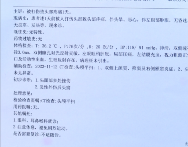 事后韦先生前去医院做了鉴定,初步诊断为头面部多处挫伤,急性外伤后头疼,医药费花了700多元。