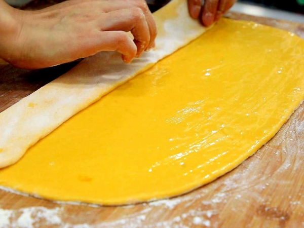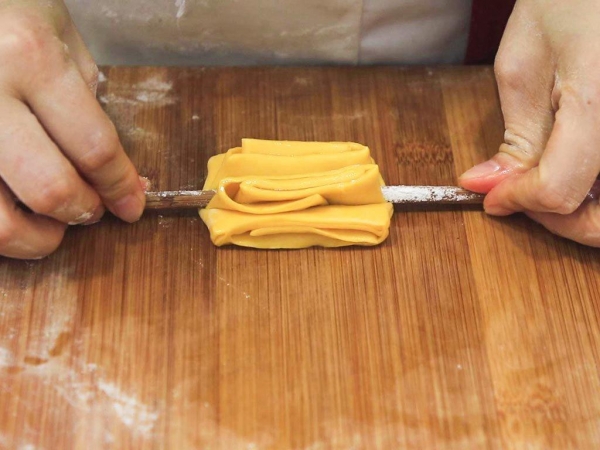 3.然后从一边往另一边开始折,一点一点地折起来,折完以后把多余的面片切下来。然后切成三厘米左右的方块。