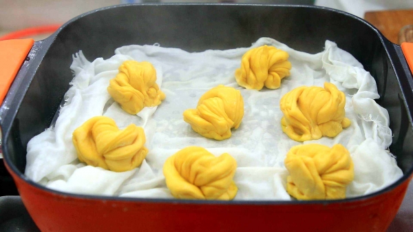 4.10分钟以后,我们取出电蒸锅,锅热以后铺上一层棉沙布。把花卷放进锅内开始上锅蒸。
