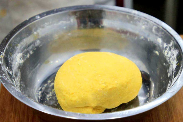 等南瓜泥稍微凉一下,温度不超过30度时,倒入酵母3克,搅拌化开酵母,倒入普通面粉200克,揉成南瓜面团。