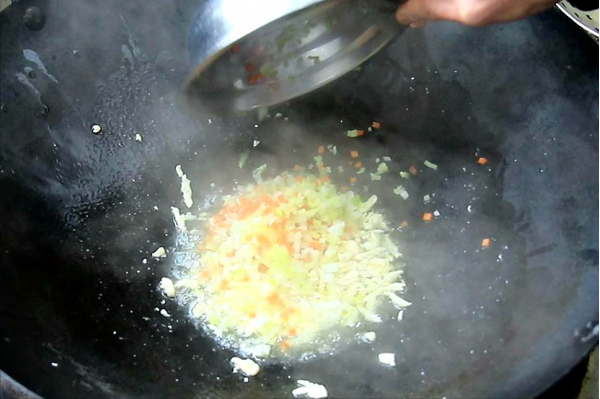 2.锅内烧油,油烧热以后 倒入鸡肉丝,翻炒至鸡肉丝发白,倒入准备好的葱姜、胡萝卜粒,继续翻炒出葱姜的香味。