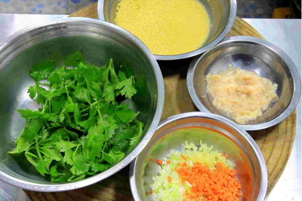 1.准备一把小米,淘洗干净以后用清水浸泡10分钟。新鲜的芹菜一把,摘下一点嫩的芹菜叶,放在盆中清洗干净。