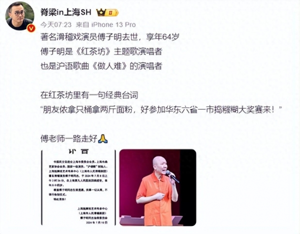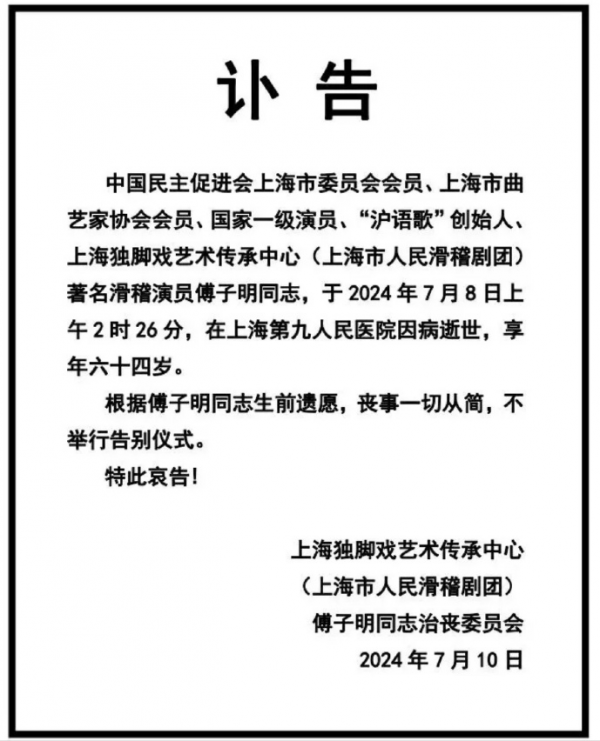 7月11日,著名滑稽戏演员、国家一级演员傅子明因病医治无效,在上海第九人民医院去世,享年64岁。
