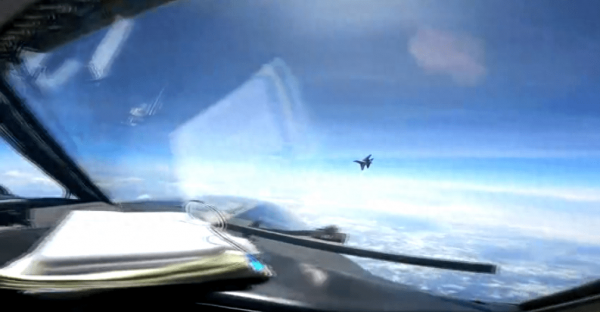 【歼-16用高速掠飞的尾流强行驱离RC-135】