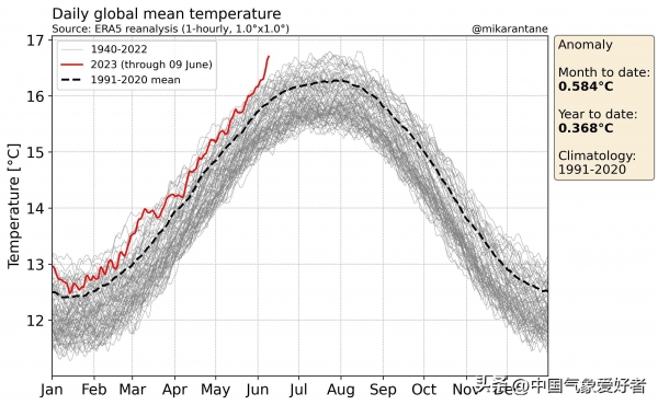 此前,有记录以来最热的一年是2016年,而本月的气温记录显示,2023年的气温可能接近2016年。欧盟地球观测计划--哥白尼计划的数据显示,气温峰值出现在6月9日,当时全球平均气温为16.7度,仅比2016年8月13日有记录以来的最高气温低0.1度。