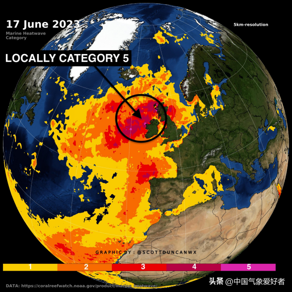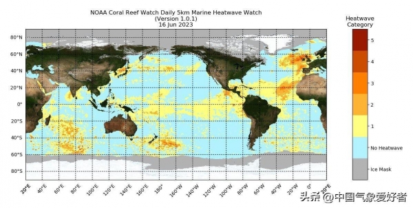 海洋也显示出了相当不寻常的迹象,比如全球海水温度正处在高点,尤其是北大西洋,6月海温已经打破了历史同期纪录。气象学家分析认为,尤其是在北太平洋爱尔兰和不列颠群岛附近,正处于异常海洋热浪的中心。在现代记录中,研究者们从未见过北大西洋是这样的,海洋热浪分为1到5,有热点达到最高级别的5级热浪。而在南半球,南极海冰则处在前所未有的低点。2023年盛夏还未到来,气候信号已经相当不友善。
