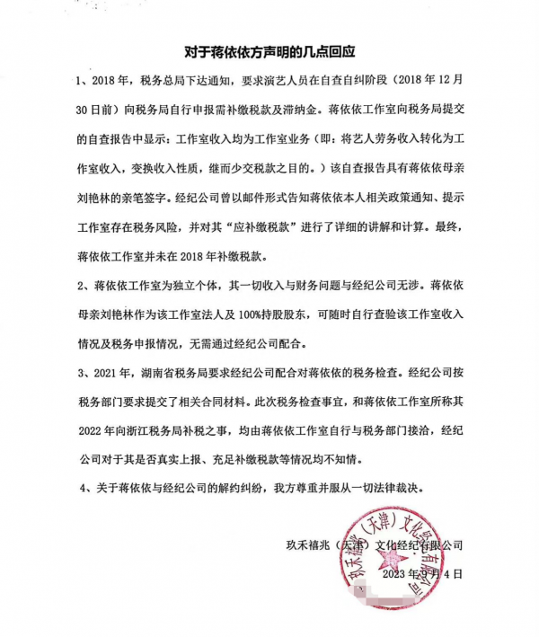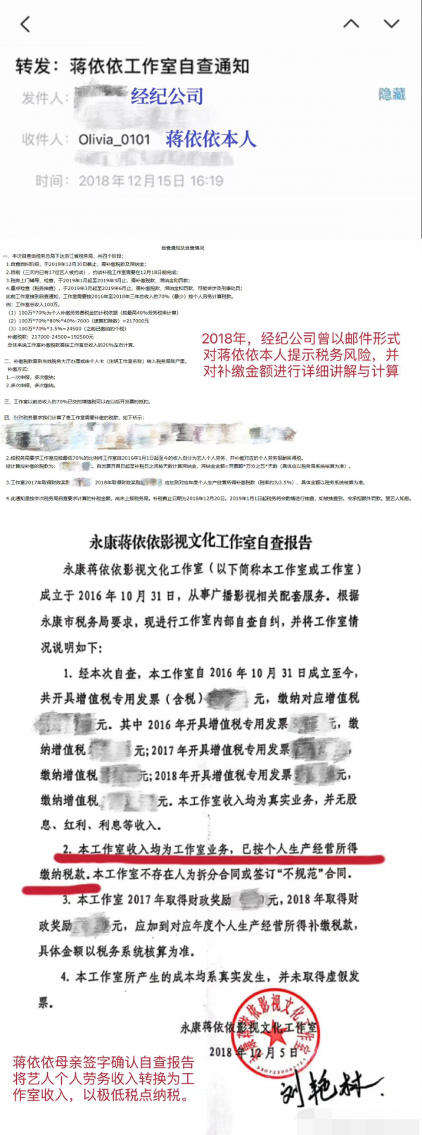 前公司还晒出了蒋依依工作室的自查报告,称其将个人劳务转换为了工作室收入,已降低纳税点,尾部还有蒋依依母亲的签名。