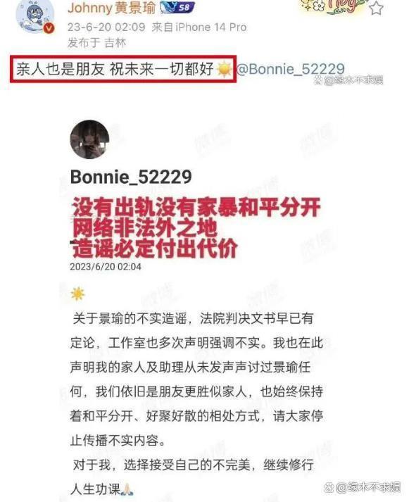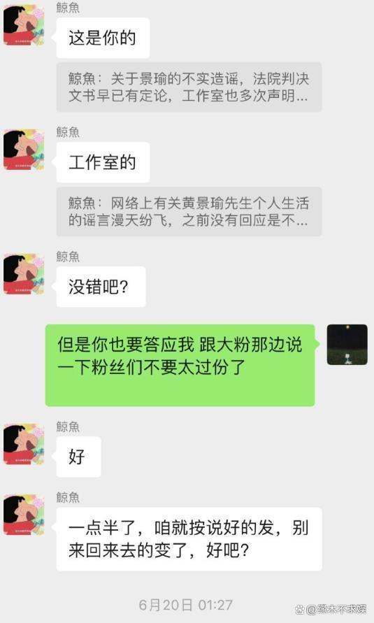 王雨馨还晒出了和黄景瑜方的聊天记录,时间是在今年的 6 月 20 号,两人在协商发布声明。黄景瑜还特意叮嘱王雨馨"咱就按说好的发,别来回来去的变了"。