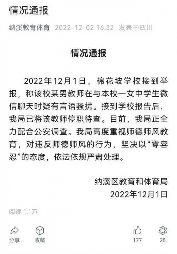 针对此事,泸州市纳溪区教育和体育局紧急发布通报,宣布暂停涉事教师职务,并积极配合公安机关的调查工作。该局表示高度重视师德师风教育,对任何违反师德师风的行为均将"零容忍",依法依规从严处理。