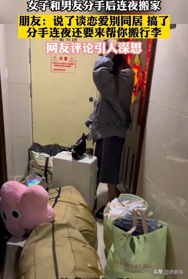 最后随着女子的赶到,局势才有些好转,最终二人合力将所有物品移至停车场,为此女子不禁向闺蜜吐槽道:"早就跟你说过谈恋爱别同居,现在分手了搞得连夜还要帮你搬行李,你再知道后悔了吧"!