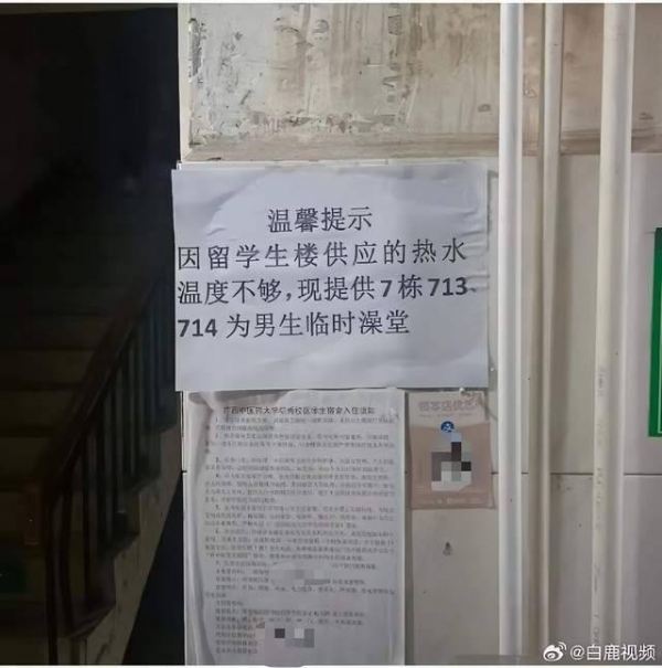 据白鹿视频报道,11月15日,广西南宁一大学生发文称,学校让男生到女生宿舍洗澡,并张贴提示称"因留学生宿舍楼供应的热水温度不够,现提供7栋713、714为男生临时澡堂"。