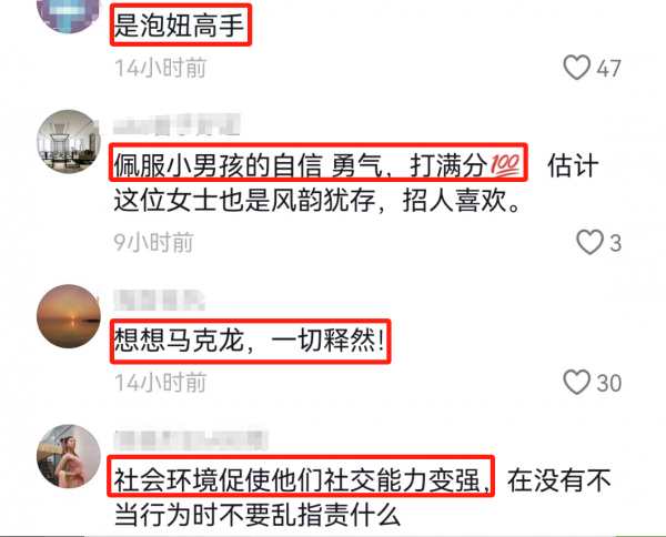 男孩随后说道"我都上6年级了。"李女士也跟着说道"我没保养啊!""没保养,三观再次震碎了"男孩马上又跟上一句。此时二人的对话还很随和,在李女士的言语中也能听到一些笑声,对于男孩的突然"搭讪",她做出的反应也没有太意外,应该像和自己的娃一样当成孩子来看待。