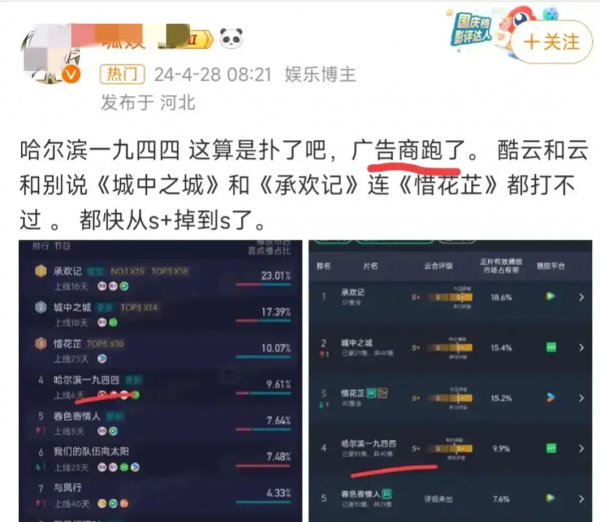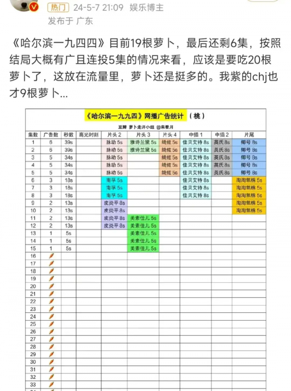 《哈尔滨一九四四》开局广告很多,但到后面每况愈下,播着播着广告商全跑了,吃了很多根萝卜。