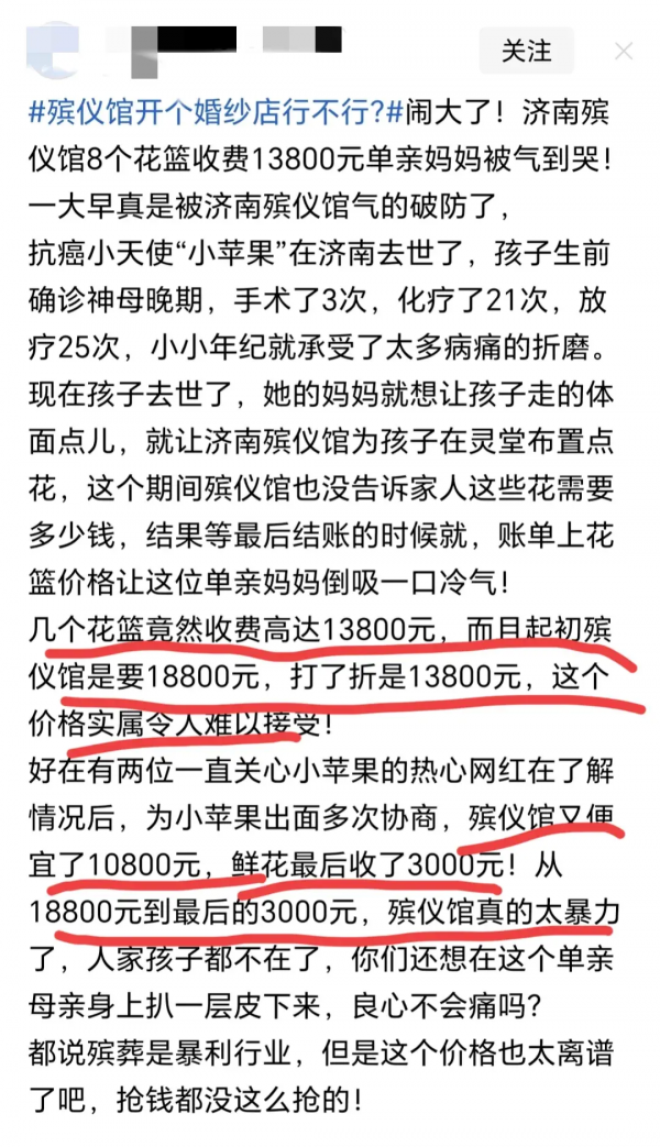 上述这些话,是山东济南某殡仪馆老板的说辞,据该老板表示,这些花篮13800元卖出去,自己不仅不赚钱,而且还赔钱了,到底是什么样的鲜花,竟然敢收13800元,而且这还是在便宜了的基础上,据说老板原来要价18800。事情到底怎么回事,我们一起来梳理一遍。