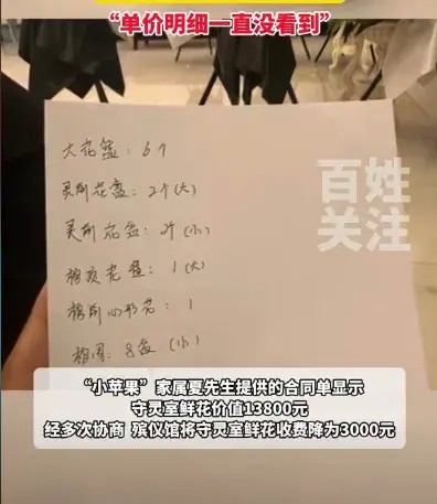 "大大小小一共22个花篮,殡仪馆工作人员说这个报价他也很吃惊,说送花篮那边给他报的价,那张纸上有写"布置前要告知客户",甲方在所有费用前,要明确告诉乙方,但是这个花篮费用没告诉家属,小苹果妈妈签了字,后经协商,费用从13800元降至3000元,改为租赁鲜花,后续将回收。"一位知情者告诉记者。