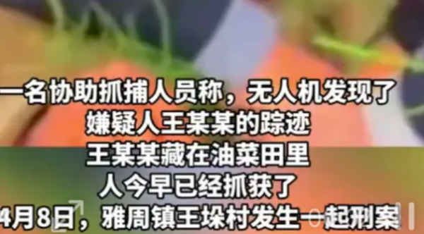 4 月 10 日早上,警方在当地村庄的一片油菜花田里将犯罪嫌疑人王兆民抓获归案。据当地一村民介绍,当天 8 时许,无人机发现王兆民躲在雅周镇钱庄村的一个油菜花田里,警方随即将其抓获。