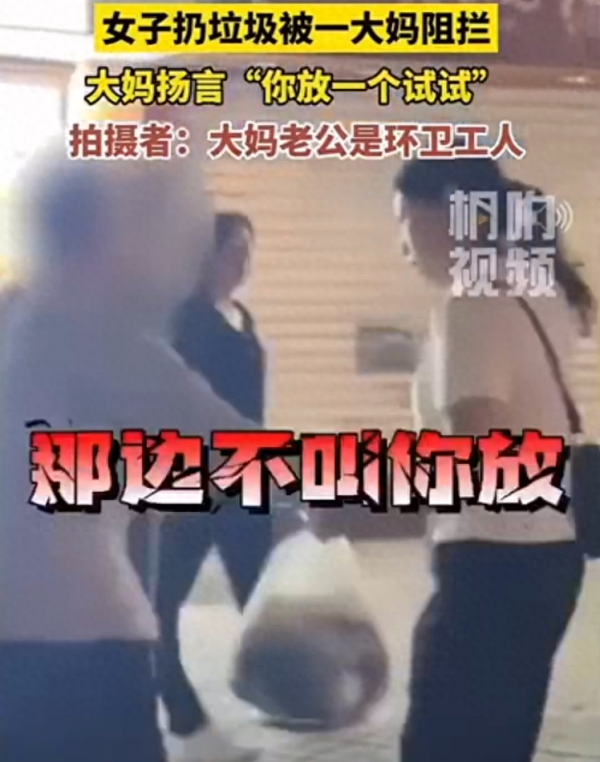 画面中,一位身穿白色上衣的年轻女摊主手提一包垃圾准备扔进垃圾桶。一位看起来六七十岁的大妈用手按住垃圾桶的盖子,不让女摊主扔垃圾。