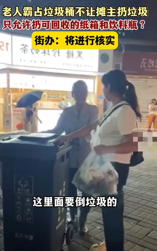女摊主看到旁边还有一个垃圾桶,就走过去打算把垃圾放在那里。不料,老太太又追过来说道:"这个也不能放,这个是用来倒垃圾的。"