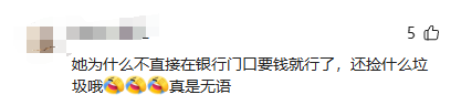 她为什么不直接在银行门口要钱就行了,还捡什么垃圾哦真是无语