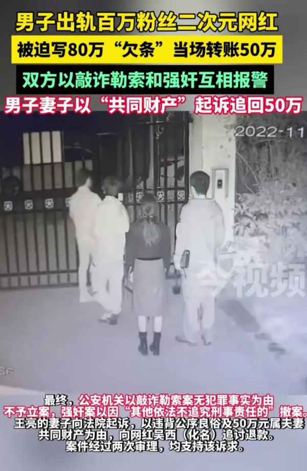 但是最后两人的目的都没有达成。敲诈勒索无犯罪事实不予立案,强奸案也被撤案。本以为这件事就这么过去了,可是男子妻子却出人意料地将女网红和其丈夫告上法庭,理由是违背公序良俗和50万是夫妻共同财产!最后胜诉成功追回来50万。