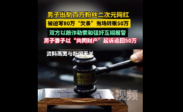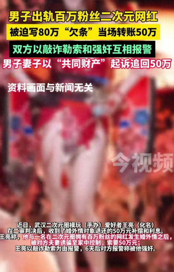 近期,武汉一男子出轨二次元网红,又被网红夫妇仙人跳索要50万,又被男子妻子起诉追回的新闻引发广泛关注。