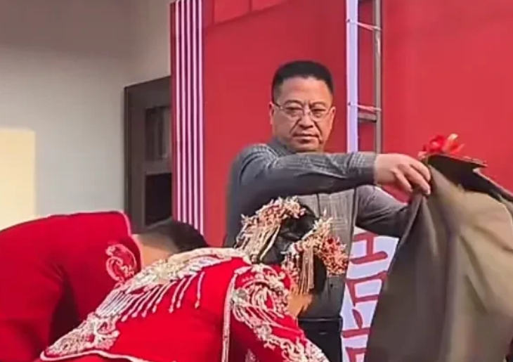 男方的父亲看到新娘比较冷,便直接从座位上起来,脱掉了自己的外套,披到了新娘的身上。随后,这位父亲准备返回座位时,发现衣服没有披好,便再度返回来,帮助新娘整理好了衣物。