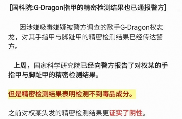 在第一次检测过后,20日,警方公布了权志龙的毛发精密检测结果,依然是阴性。这个结果让不少人松了一口气,但仍有不少人对他的清白持怀疑态度。在这个关键时刻,国科所出面澄清,表示早就将指甲的检测报告交给了警方。