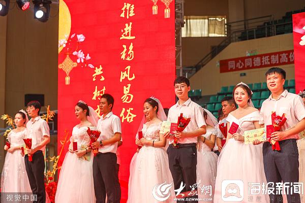 2022年7月31日,江西鹰潭,中国农历"七夕"前夕,在余江区,36对"零彩礼"新人举行了一场集体婚礼,婚礼现场。这场集体婚礼旨在破除高价彩礼、大操大办等陈规陋俗。 中新社记者 刘力鑫 摄