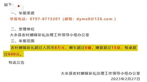近日,江西赣州大余县一则关于农村婚嫁彩礼举报公告也引发关注。举报范围包括农村婚嫁彩礼超过人民币8万元,婚车超过6辆,婚宴超过15桌,每桌超过800元。