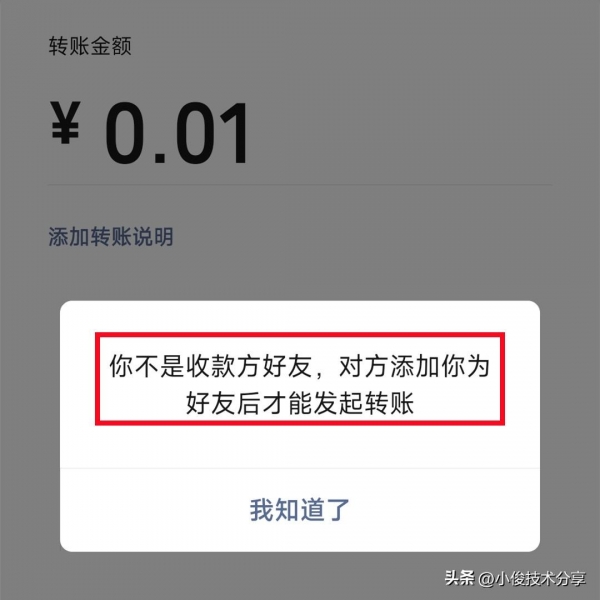 第二种情况,如果我们在转账页面只显示的对方的微信名称,没有显示小括号,而我们点击转账的时候,也没有出现输入密码页面,而是直接出现你不是收款方好友,对方添加你为好友后才能发起转账的提示,那么这个时候啊,就说明对方已经把我们删除了