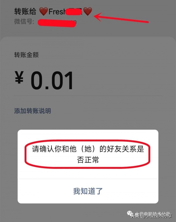 第三种情况,如果我们在转账的时候,出现的是请确认你和他的关系是否正常的提示,那么此时啊就说明这个好友已经把我们拉黑了!