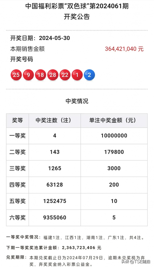 全国开出一等奖5注,单注奖金956万余元;二等奖90注,单注奖金31万余元;