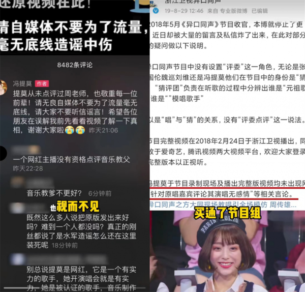 几年前,在一档综艺节目《异口同声》当中,冯提莫作为一个网红博主,被曝在节目当中点评前辈周传雄,称他的音乐没有感情。实际上她根本就没有任何点评的动作,没有说过任何点评的话。媒体发出的视频里面也没有她说的话,而是自媒体自己的画外音,根本就是子虚乌有的事情。