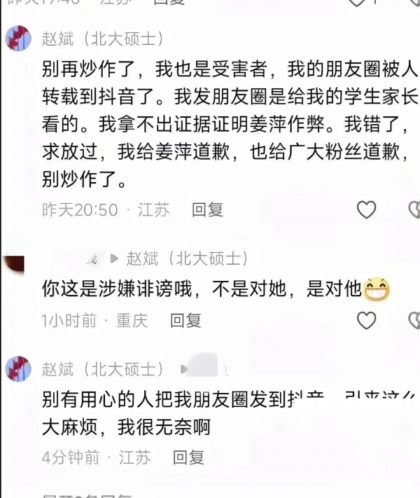 后来赵斌发表声明并道歉:"我没有说姜萍作弊没有证据,17岁的未成年人面对我们这些大人的攻击压力,心理上和精神上的打击是非常大的。这个事情上我没有说清楚,也没有说对,我道歉。而且我要把之前承诺的500万元捐款给她。"