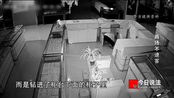 0:31,似乎是听到保安走远的声音,男子从柜子里钻出来,迅速跑进商场的安全通道,保安发现后追赶未果,立即报了警。侦查人员和技术人员到达现场后迅速展开调查,据专柜营业人员计算,案发当晚丢失了3万多元的黄金饰品。