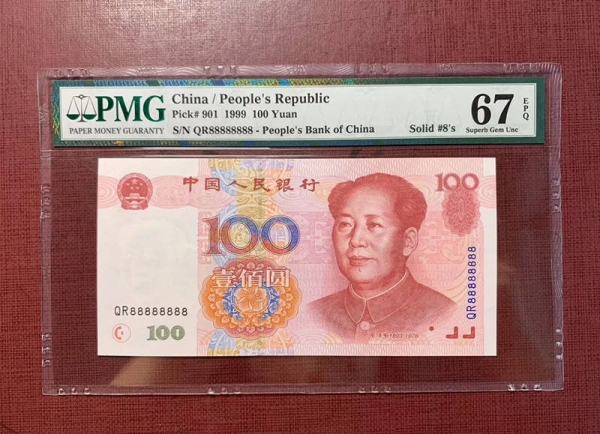 看上图,这是一张1999年的100元纸币,它的报价是18万元左右,这是因为这张99年的100元纸币是一张67分的评级币,并且它的冠号是8同8的麒麟号纸币,这样的通天号纸币再加上吉祥数字8,收藏价格更是高了不少。你是能找到这样的100元纸币来呢?有的话一定要好好保存了哦!