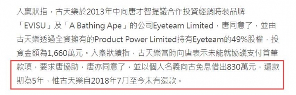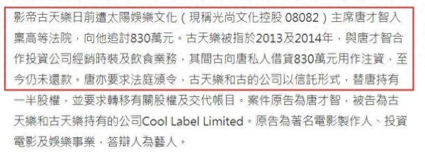 港媒指在合作期间,古天乐向唐私人借贷830万元用于注资,且至今未还款,唐才智要求法庭颁令,古天乐和古的公司以信托形式,替唐持有一半股权,并要求转移有关股权及交代项目。