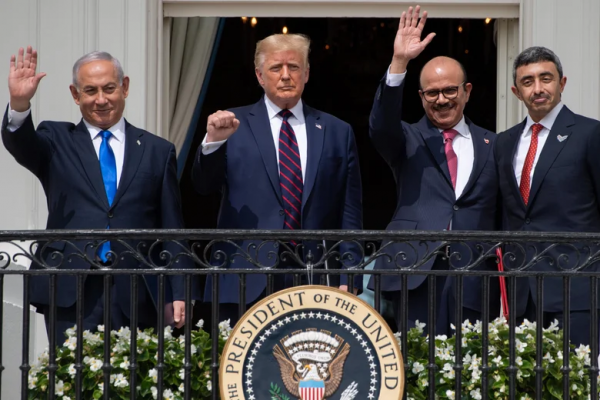 《亚伯拉罕协议》签署现场,特朗普身边分别是以色列总理内塔尼亚胡
