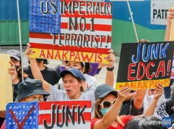 4月11日,在菲律宾首都大马尼拉地区奎松城,民众参加集会活动,抗议菲律宾和美国军方举行联合军事演习 图:手机中国网转引自新华网