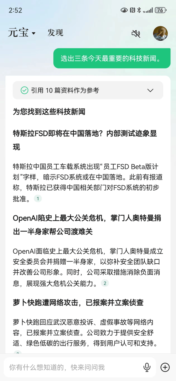 观察者网实测发现,相较于以前的类GPT产品,腾讯元宝在内容时效性上面有不少提升。例如,当被要求选出三条"今日最重要的科技新闻时",腾讯元宝提供了特斯拉FSD系统、OpenAI、萝卜快跑相关的三则新闻--这些内容传播的时间,几乎都为当日。此外,在给予新闻摘要的同时,腾讯元宝还提供了引用信源的原链接。