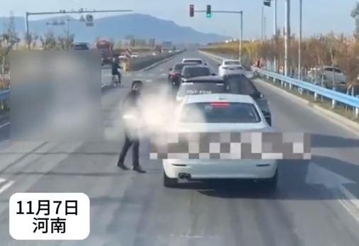 11月7日,河南。疑似男子因超车失败情绪失控,视频显示,男子拿着菜刀对着一辆白色宝马车疯狂乱砍,并想要拉开车门,情绪看着十分激动。