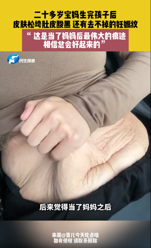 近日就有很多宝妈在社交平台上晒出了自己产后的肚皮。视频中,22岁女孩晒自己剖腹产的肚子,只见曾经白嫩光滑的肚子变得松松垮垮,肚子上长满毛,妊娠纹布满整个肚子,看着有些可怕。