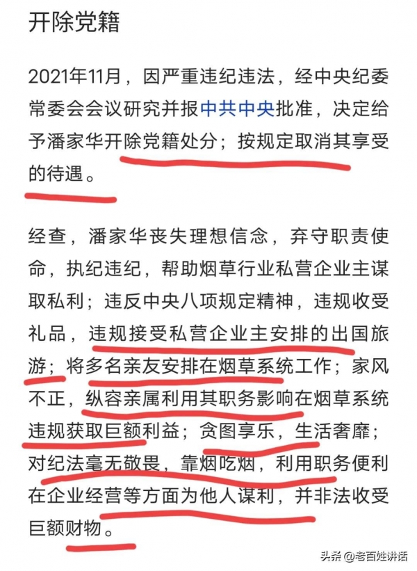 2023年4月4日,中央纪委监委网站消息,曾任中央纪委派驻国家烟草专卖局纪检组组长、国家烟草专卖局党组成员潘家华因为涉嫌受贿被判有期徒刑十一年,并且处罚150万人民币。