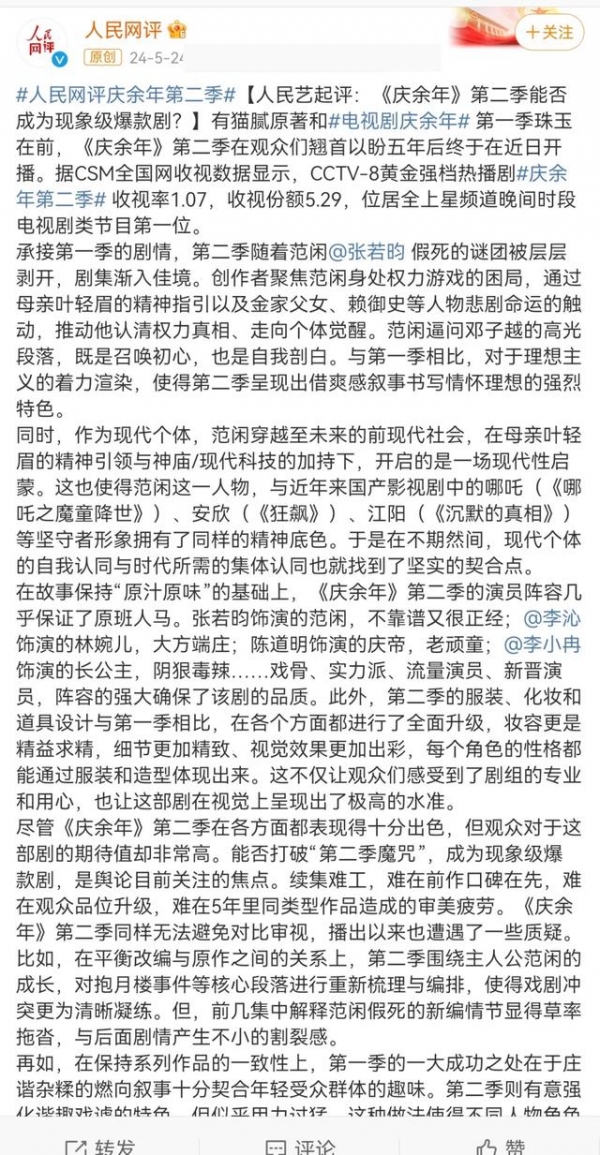 这是人民网评对该剧的肯定,同时也肯定了多位演员的表达。