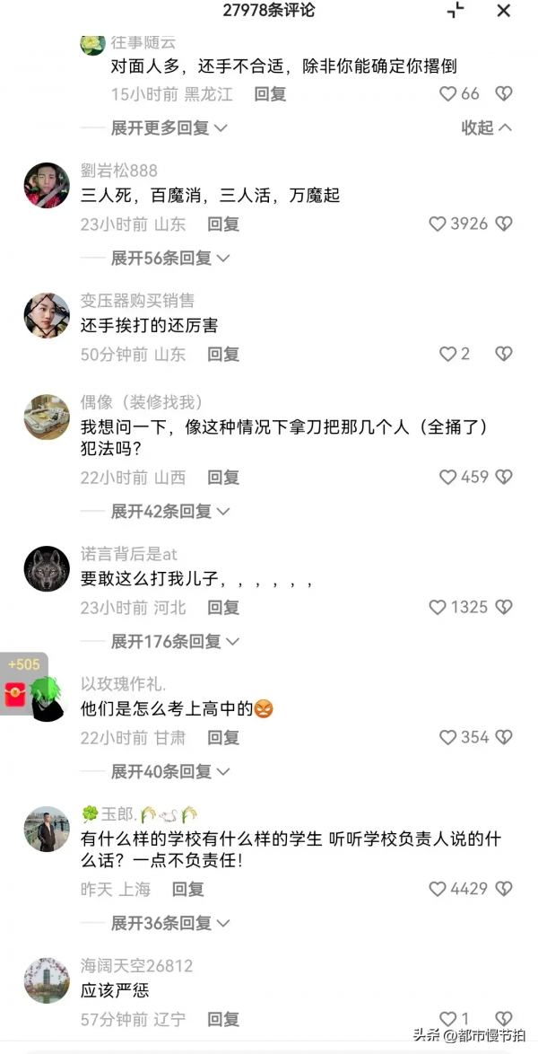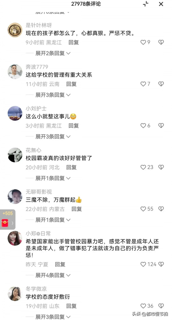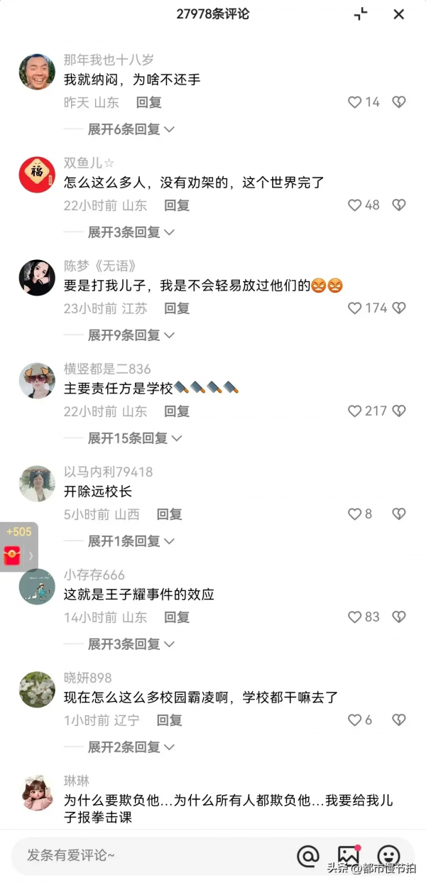 评论区2万多条的评论,可见大家对此事的关注度之高,不乏有情绪激动的家长说,如果是自己孩子受欺负,自己会直接上场,愤怒之情溢于言表。