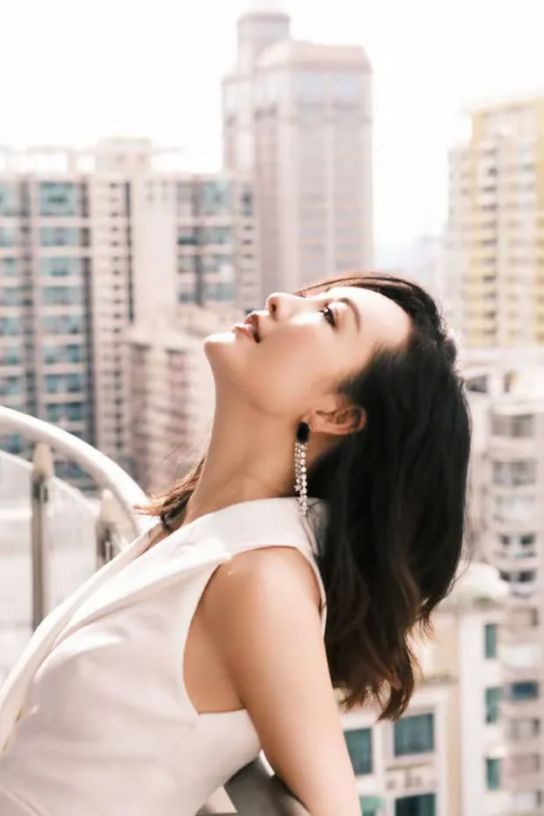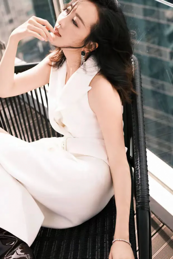 王鸥身着白色无袖长裙,曼妙身姿被完美勾勒。
