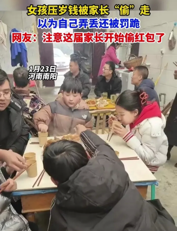 1月20日,河南,一个女孩的压岁钱被妈妈拿了,妈妈说小孩给弄丢了,还让小孩罚跪。