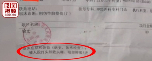 家长提供的就医证明显示,学生自述出现被打后头痛、眼部肿胀症状。