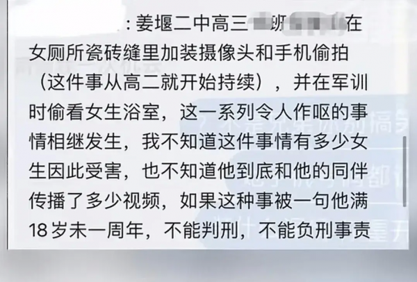 该网友表示,该男生不止是偷拍行为,还有在军训时偷看女生浴室多种不道德行为。