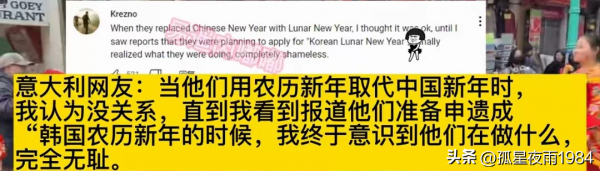 意大利网友说:当他们用农历新年取代中国新年时,我为认没关系,直到我看到报道他们准备申遗成,韩国农历新年的时候,我终于意识到他们在做什么,完全无耻。